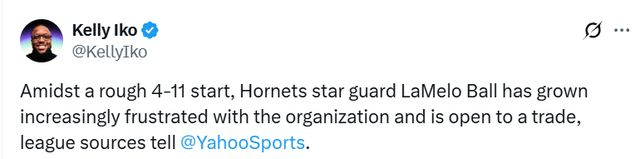 北京时间11月21日,据名记Iko报道,多位联盟消息人士透露,在黄蜂队客场令人失望地不敌仅2胜13负的步行者队后(遭遇四连败,战绩跌至4胜11负,排名东部第12位),明星后卫拉梅洛-鲍尔(三球)对球队的不满情绪日益加剧,并且愿意被交易离队。