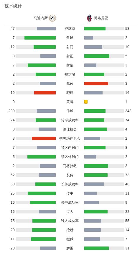 北京时间11月22日意大利足球顶级联赛 联赛 第12轮,乌迪内斯主场对阵博洛尼亚。博洛尼亚波贝加梅开二度,贝尔纳代斯基破门。最终比分乌迪内斯 0-3 博洛尼亚。
