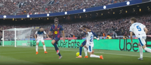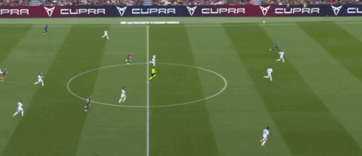 第44分钟,错失良机,亚马尔拉球后面对大半个空门将球踢在门框上